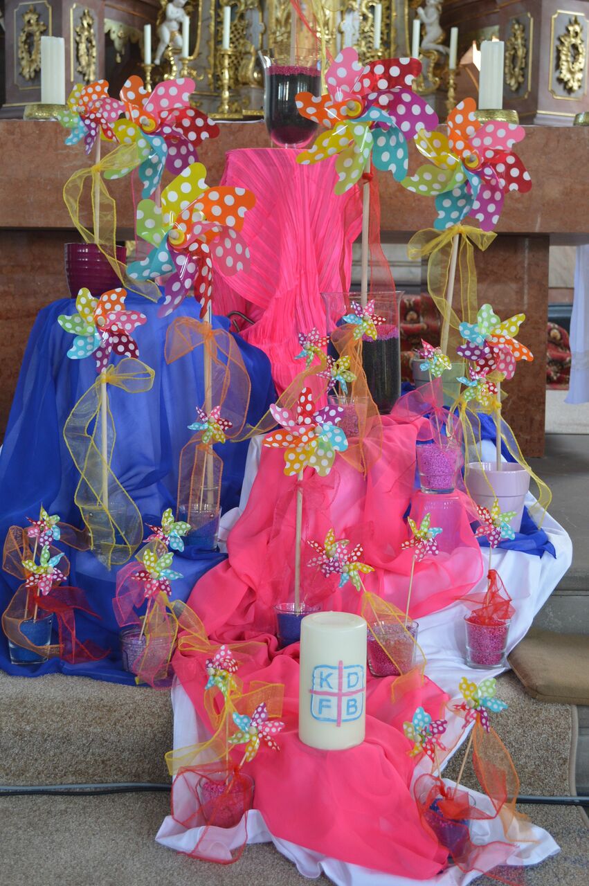 Leuchtend bunte Windräder luden alle Kirchenbesucher ein, sich auf eine Reise mit Rückenwind zu machen und zu fordern, was schon seit dem 2. vatikanischen Konzil immer wieder thematisiert wird: Die offizielle Legitimation des diakonischen Wirkens von Frauen im Auftrag der Katholischen Kirche durch ihre Weihe. Im Grunde die öffentliche Anerkennung für tägliches Engagement, welches Frauen in jeder Pfarrei schon immer zeigen. Frisch untermalt durch die Musikgruppe Spirit Kitchen aus Sulzbach war die Wort-Gottes-Feier, organisiert von Edeltraud Hann (1.Vorsitzende des KDFB im Bistum Würzburg) und Karin Post-Ochel (Bildungswerksvorsitzende des KDFB im Bistum Würzburg) mit Frauen aus dem Zweigverein Kleinwallstadt, ein beeindruckendes Beispiel dafür, wie lebendig und mitreißend Frauen Kirche gestalten können.