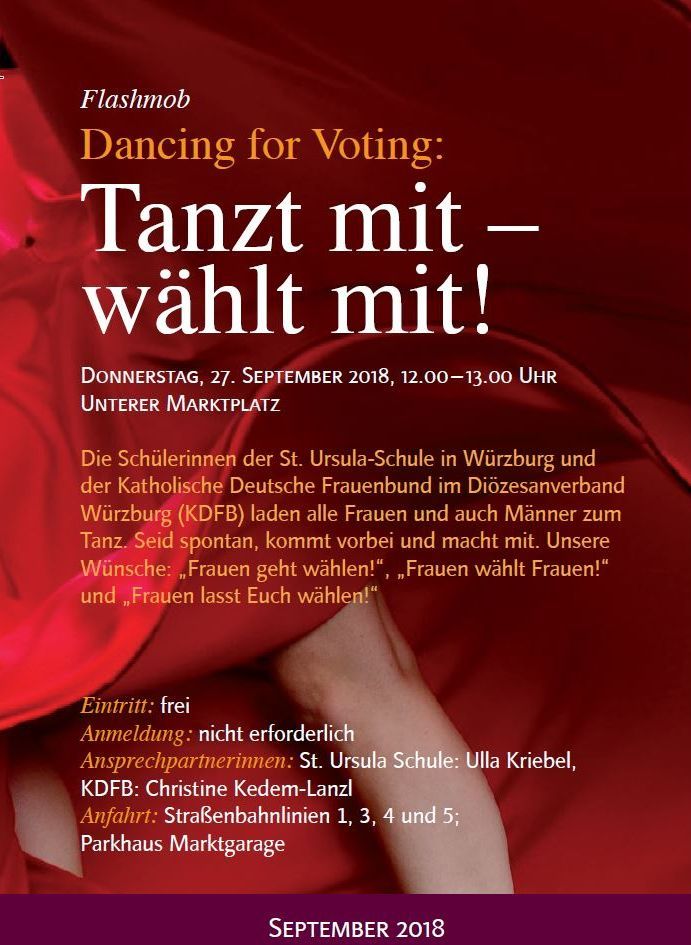 gestalten. Wir wollen öffentlich zu zeigen, dass Politik uns alle angeht und darauf hin weisen, dass Frauen gute Politik machen und nicht nur als Aushängeschild der Parteien fungieren sollten.„Frauen geht wählen“, „Frauen wählt Frauen“ und „Frauen lasst Euch wählen“ - dies sind unsere Wünsche. Eingeladen mit uns zu tanzen ist jede Frau und jeder Mann. Wir wollen auch zeigen, dass in unserer pluralisitschen Gesellschaft jeder Mensch seinen Platz hat. Niemand darf Grund seines Geschlechtes, seiner Religion oder seiner Hautfarbe ausgrenzt oder verurteilt werden. Würzburg ist bunt - lasst es uns gemeinsam noch etwas bunter machen!