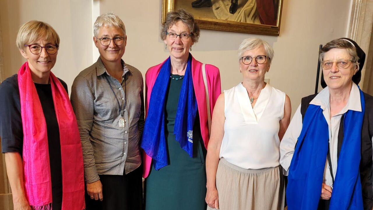 Bildunterschrift: v.l. stellvertretende Landesvorsitzende Sabine Slawik, Generaloberin der Oberzeller Franziskanerinnen Sr. Dr. Katharina Ganz, KDFB Bildungswerkvorsitzende im KDFB Diözesanverband Würzburg e.V. Edith Werner, Preisträgerin Karola Herbert und Geistliche Beirätin des KDFB Diözesanverband Würzburg e.V. Sr. Margit Herold