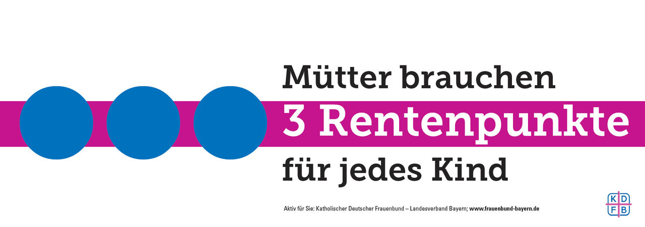 Bayerns größter Frauenverband hat nicht locker gelassen. Er hat seine Forderung „Mütter brauchen drei Rentenpunkte für jedes Kind“ aufrechterhalten, auch nachdem 2014 der zweite Rentenpunkt für ältere Mütter erreicht war. Der Katholische Deutsche Frauenbund fordert seit Jahren: Die Ungerechtigkeit bei der rentenrechtlichen Anrechnung der Erziehungszeit zwischen den Generationen muss verschwinden.