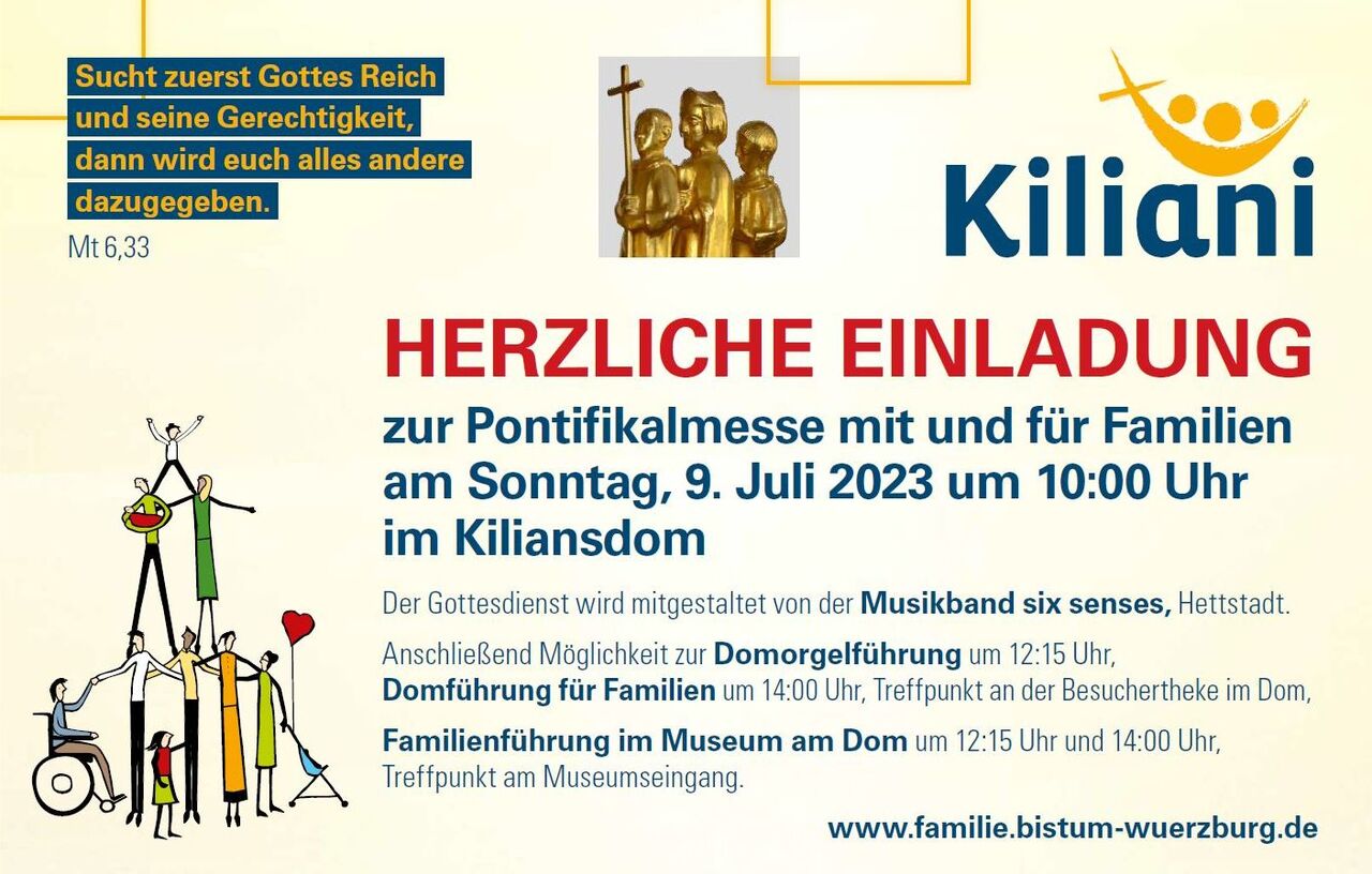 Besonders hinweisen möchten wir an dieser Stelle auf den Kiliani Familiensonntag am 09. Juli 2023 um 10.00 Uhr. Die Ponifikalmesse findet im Kiliansdom statt, anschließend eine Begegnung mit Imbiss auf dem Kiliansplatz. Eine Domorgelführung, Domführungen durch den Dom und Familienführungen im Museum am Dom sind weitere Angebote vor Ort.