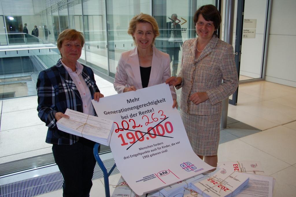 Die beiden größten katholischen Frauenverbände, die über 800.000 Mitglieder vertreten, fordern bei der Anerkennung von Erziehungsleistungen in der Rentenanrechnung drei Entgeltpunkte pro Kind und zwar unabhängig vom Geburtsjahr der Kinder. „Wir halten die bestehende Regelung, bei der Frauen, die vor 1992 Mutter wurden und deshalb mit nur einem Entgeltpunkt pro Kind bei der Rentenberechnung berücksichtigt werden, für diskriminierend. Die geleistete Erziehungs- und Familienarbeit der heute 50 Jahre und älteren Frauen muss angemessen berücksichtigt werden“, erklärten Maria Theresia Opladen, kfd-Bundesvorsitzende, und Dr. Maria Flachsbarth, KDFB-Präsidentin, bei der Übergabe von 202.263 Unterschriften an Bundesministerin Dr. Ursula von der Leyen.