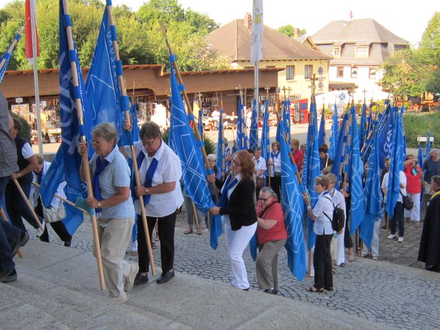 Vierzehnheiligen/Würzburg (POW) Über 2000 Frauen aus 75 Zweigvereinen im Bistum Würzburg haben am Montag, 10. September, an der Diözesanwallfahrt des Katholischen Deutschen Frauenbundes (KDFB) nach Vierzehnheiligen (Erzbistum Bamberg) teilgenommen. In der Basilika feierte der Bamberger Erzbischof Dr. Ludwig Schick mit den Wallfahrerinnen einen Gottesdienst. Mehr als 70 Fahnenträgerinnen sorgten für ein besonders feierliches Bild beim Einzug.