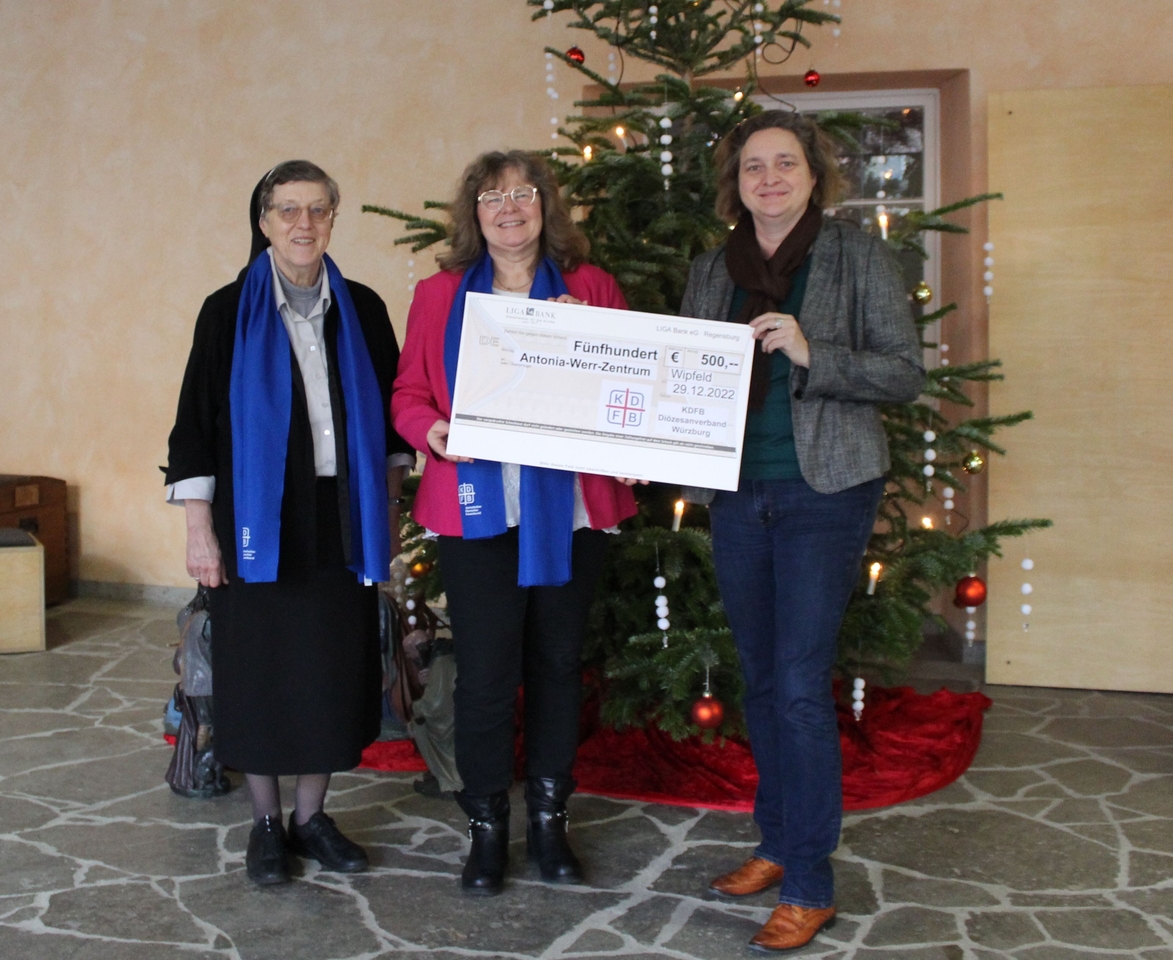 Die Kollekte kommt dem Antonia-Werr-Zentrum zu Gute. Den Scheck in Höhe von 500 € übergaben mit Freude unsere Diözesanvorsitzende Anja Bauer und unsere geistliche Beirätin Sr. Margit Herold an die Geschäftsführerin des Antonia Werr Zentrums Anja Sauerer kurz vor dem Jahreswechsel.