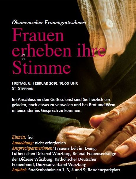 Samstag, 9. – 28. Februar 2019, 8.00 – 16.00 Uhr Eröffnung Samstag, 9. Februar 2019, 11.00 Uhr, Ratssaal Die Ausstellung beschreibt den Kampf um das Frauenwahlrecht, stellt die Würzburger Aktivistinnen vor und zeigt am Beispiel der Würzburger Stadträtinnen den langen, mühsamen Weg von Frauen in der Politik. Eintritt: freiAnmeldung: nicht erforderlichAnsprechpartnerinnen: Zonta Club Würzburg, AsF Würzburg und Arbeitsgruppe Würzburger StadträtinnenAnfahrt: Straßenbahnlinien 1, 3, 4 und 5 Ökumenischer Frauengottesdienst :Frauen erheben ihre Stimme