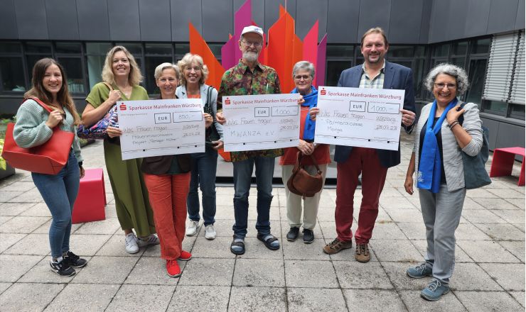 Insgesamt 2850 Euro an Spendengeldern haben Vertreterinnen und Vertreter des Vereins MWANZA e.V. , des tansanischen Partnerbistums Mbinga und des Frauenmissionswerks am Freitag, 28. Juli, im Innenh…